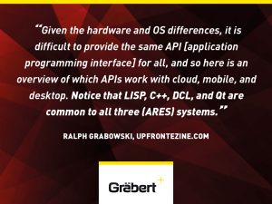 ‘Given the hardware and OS differences, it is difficult to provide the same API [application programming interface] for all, and so here is an overview of which APIs work with cloud, mobile, and desktop. Notice that LISP, C++, DCL, and Qt are common to all three (ARES) systems.’