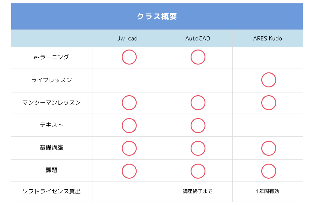 建築CAD検定3級講座におけるARES Kudoの特徴は、ライブレッスンやマンツーマンレッスンに加えて、1年間有効のソフトライセンスが使える点です。講座終了後も、ARES Kudoを使い続けることで、CADのスキルをブラッシュアップすることができます。