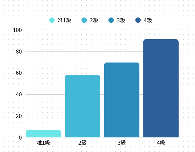 ・合格率:准1級:7.1%、2級:58.3%、3級:69.7%、4級:91.3%。
