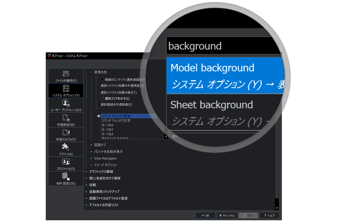 このツールのこれまで以上の使いやすさと効率性を求めて、 新しい検索ウィジェットを作りました。これにより検索プロセスがより直感的になり、ユーザーは希望の設定をすぐに見つけることができるようになりました。 検索ボックスに「用語」または「システム変数名」を入力するだけで、入力した部分文字列を含むオプションの候補リストが表示されます。マウス ポインタを候補リストの上に置くと、関連するオプションが [オプション] ダイアログ ボックスに表示されます。 さらに、ダイアログ ボックスでオプションを見つけるためのパスも表示されるようになりました。