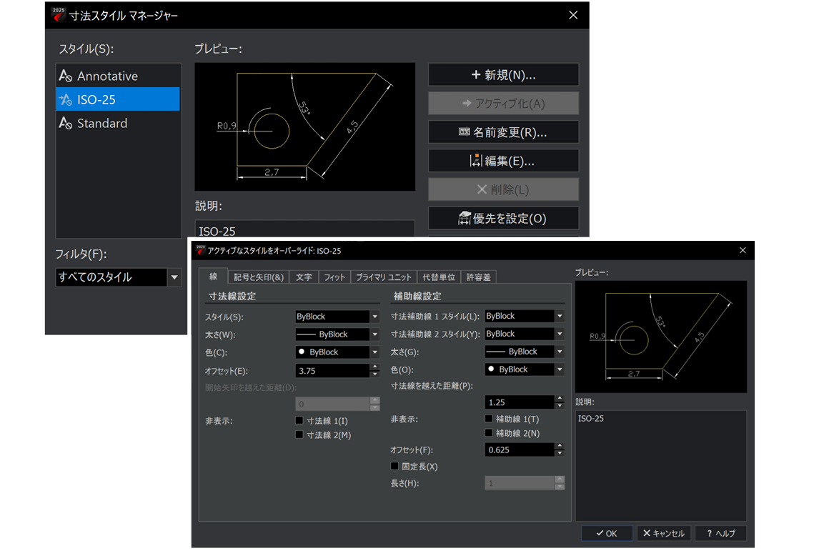 継続的な取り組みとして、ユーザーが使い慣れた AutoCADと同等のインターフェイスにしています。さらに、AutoCAD と同じオプションを使用して、ディメンション(寸法)スタイルを編集できる新機能を導入しました。 これにより、寸法スタイルを直感的に操作しながらカスタマイズできます。 ソフト移行のストレスを最小限にするために、AutoCAD のスタイルとの互換性を強化することで、いちはやくARESの環境に慣れるように設計されています。