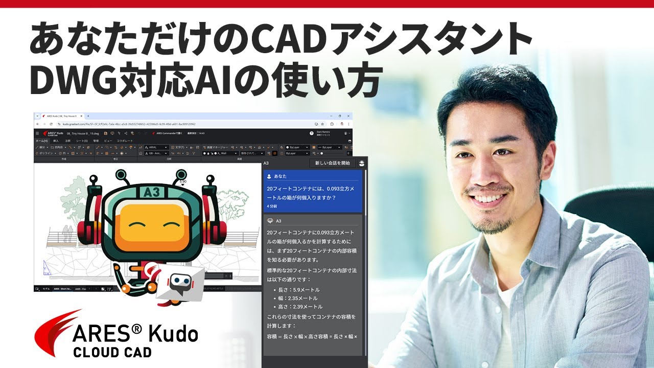 ARES Kudoには、「A3(エー・スリー:ARES AI Assist)」というAIが搭載されています。 A3はユーザーの求める言語で、CAD業務のサポートを行います。具体的には、機能の使い方を説明したり、操作を行う場所を案内したり、業界別のアドバイスを提供します。また、言語間の翻訳や単位変換、計算なども行います。