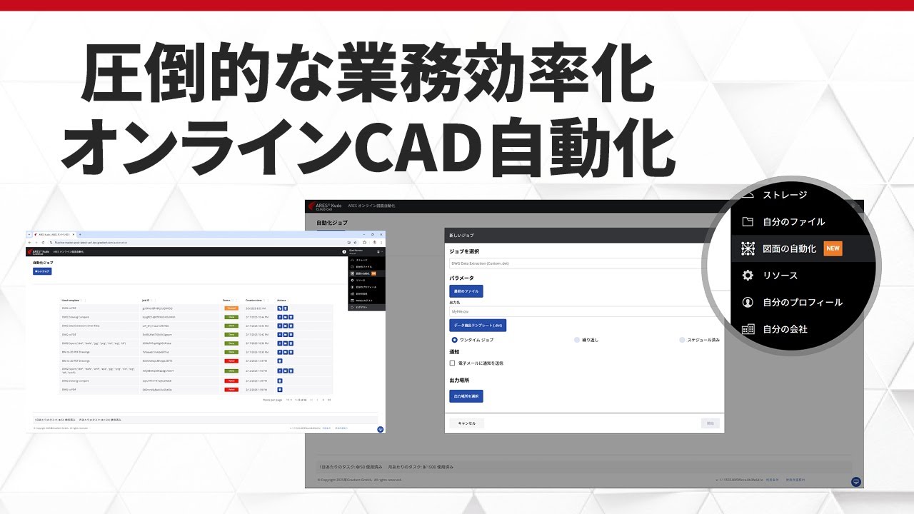 ARESのオンライン自動化機能を使えば、繰り返しの手作業をスケジュールして一括処理できます。RevitやIFCからのBIM→CAD自動図面生成、PDF/DGN→DWG変換、PDF一括印刷、DWGやBIMデータのExcel出力など、さまざまな自動処理に対応しています。
